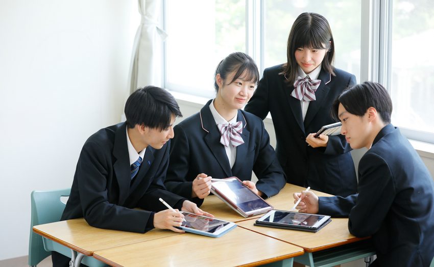 国公立大学を中心とした大学進学を目指し、少人数制による多様なカリキュラムを展開しています。各教科での学習活動やESD探究活動などにおいてタブレット端末を活用することで、アクティブかつアダプティブな学びを実現し、思考力・判断力・表現力を養います。また、ポートフォリオの構築を行い、学習や活動の振り返りを円滑にすることで、進路希望の実現に向けた支援を行います。