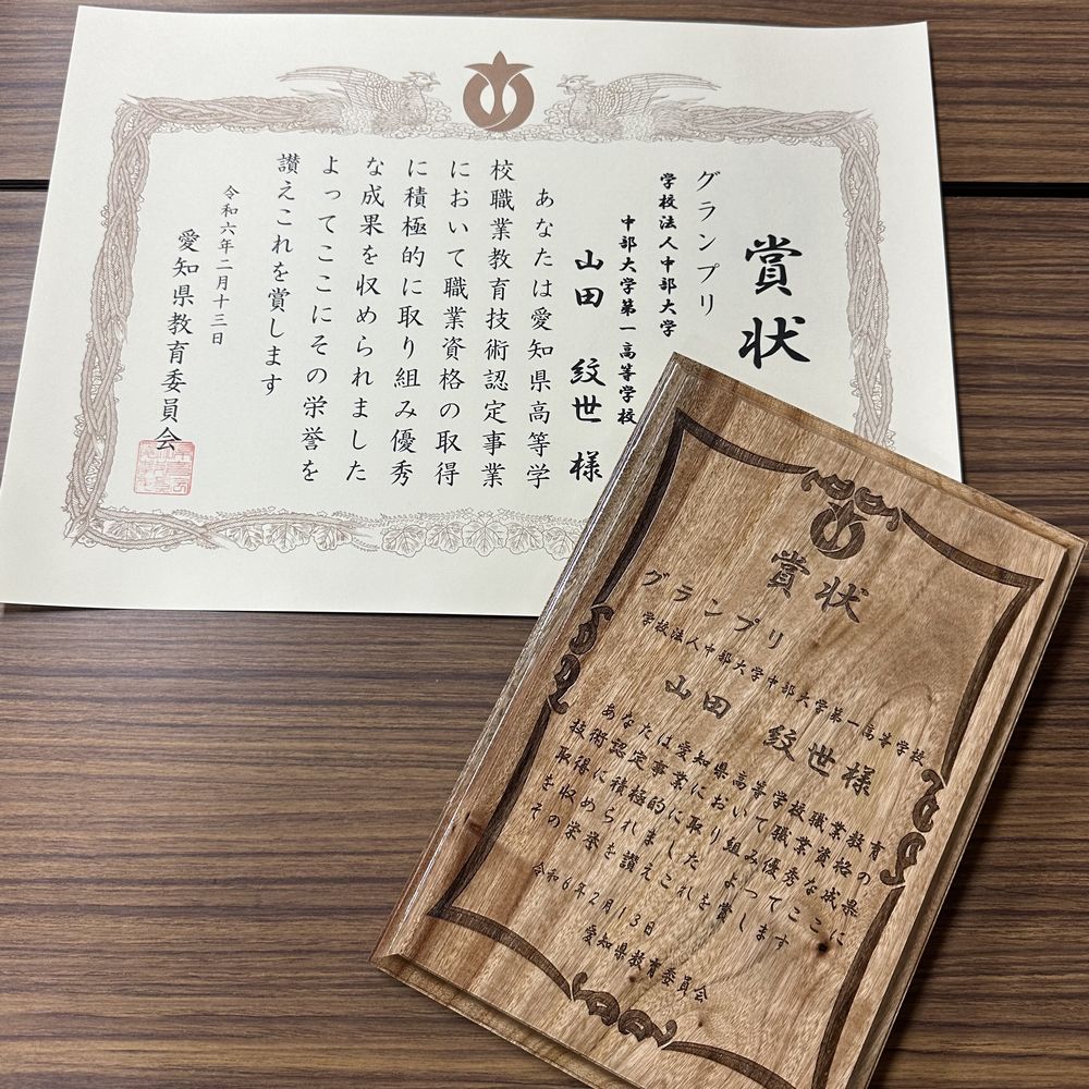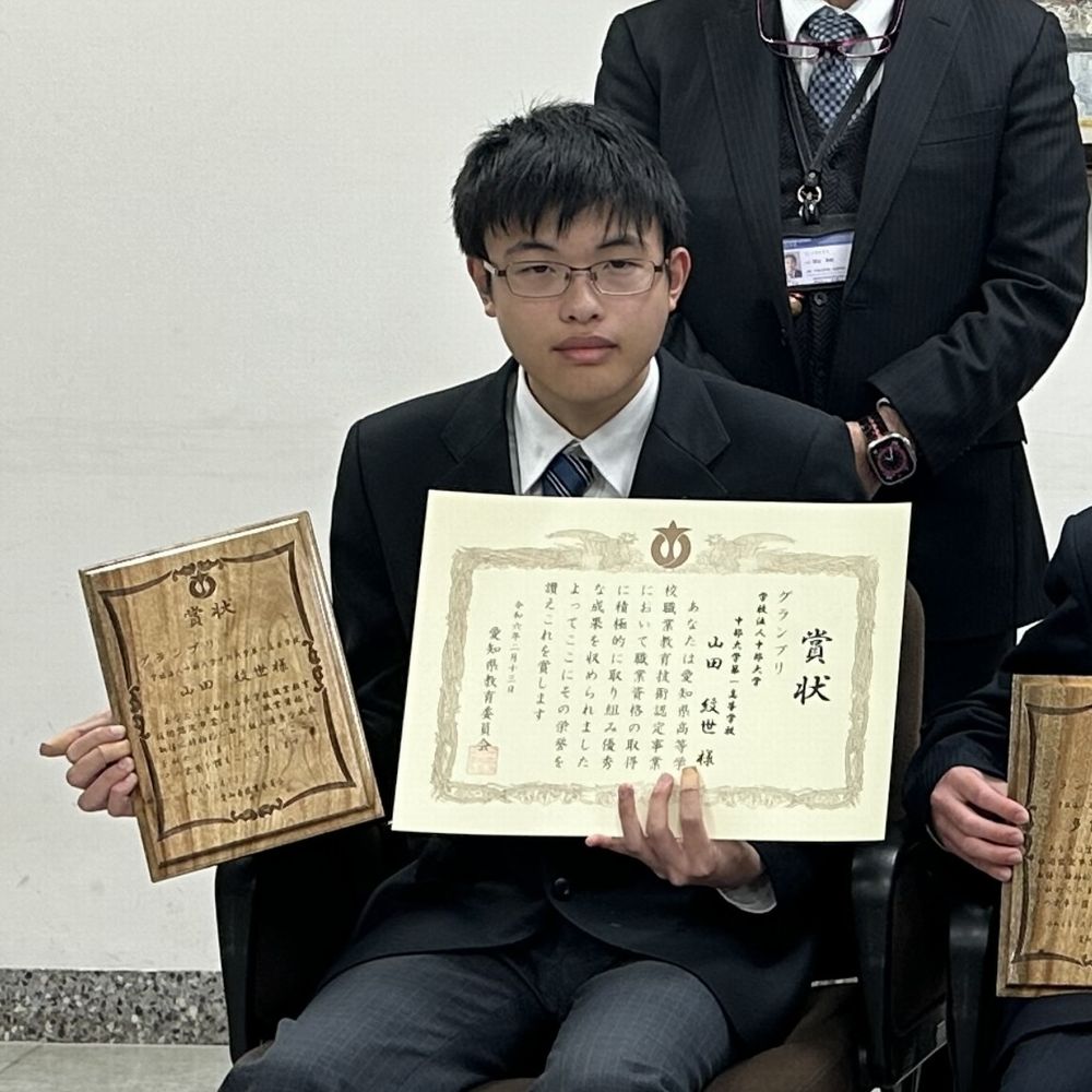 2024年2月13日(火)愛知県高等学校職業教育技術認定グランプリ授与式が行われ、本校機械電気システム科電気情報コース3年生の山田紋世君が受賞しました。